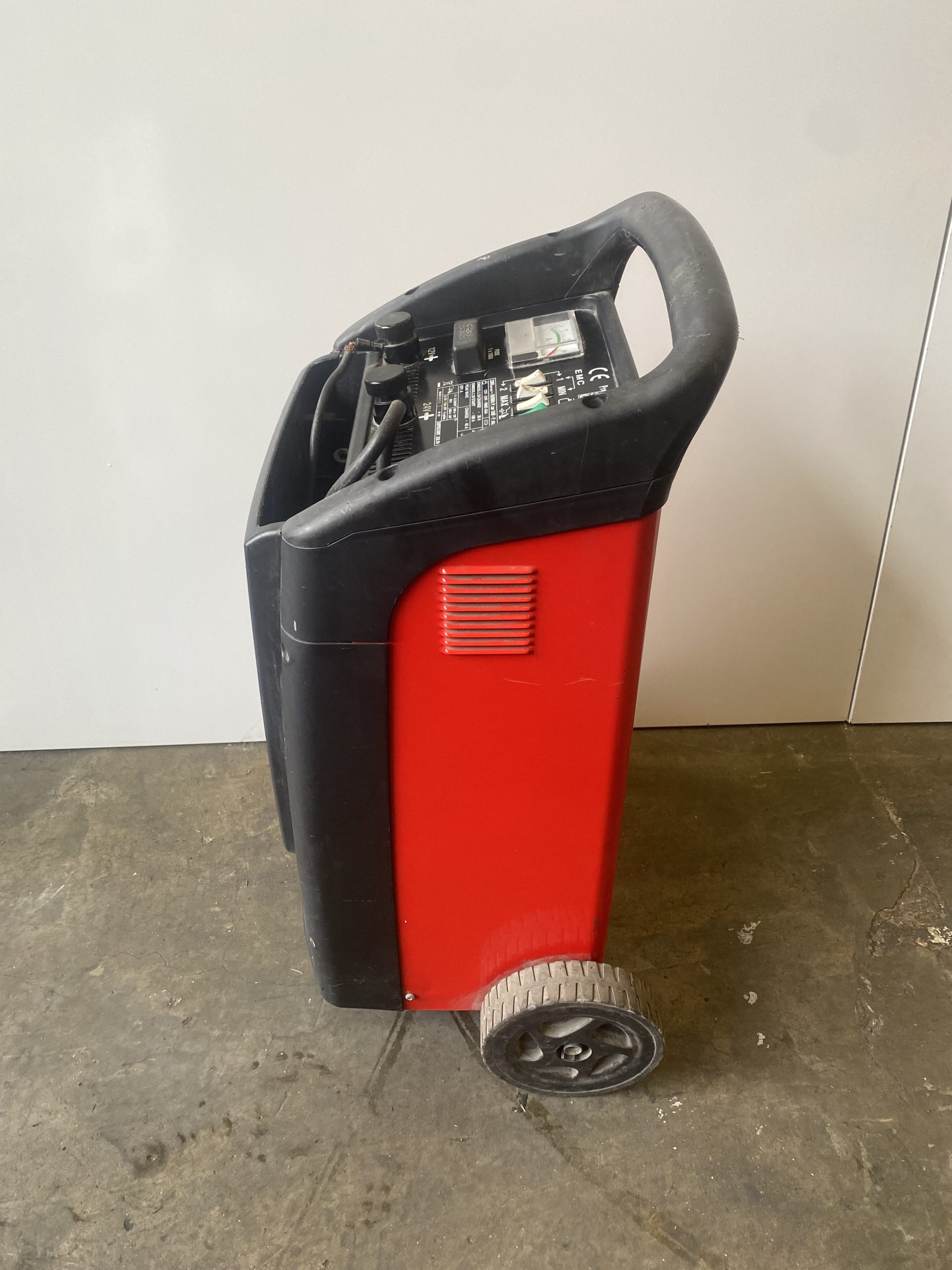Large wheels for easy mobility and features analogue ammeter and switchable charge circuitry for accurate charge control.